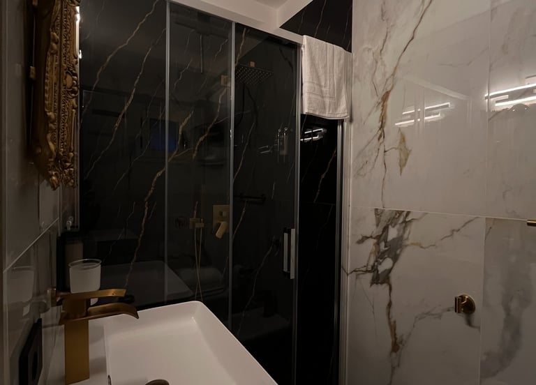 Doccia con cristalli scorrevoli e dotazioni selezionate per un esperienza di confort totale.